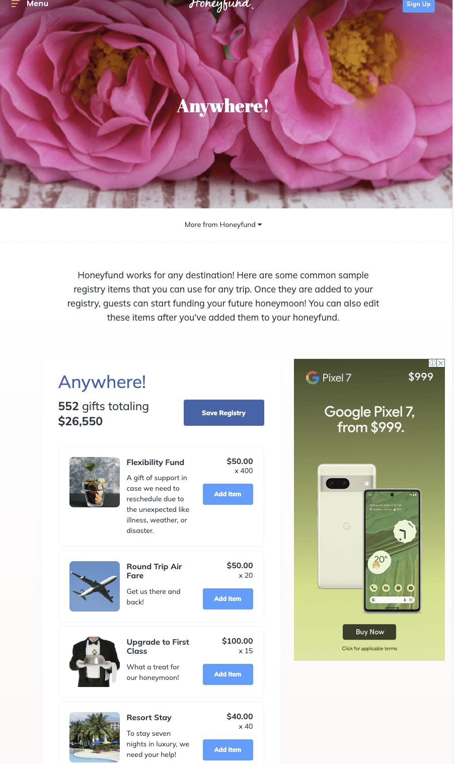 There are no limits on how much you can raise with Honeyfund service, and the funds can be used for anything travel-related, from airfare and hotels to activities and excursions. You can even use the funds to pay for your wedding planner or photographer! But they do try to push gift card purchases and show your guests lots of ads which can be frustrating and scary when they are being asked for their credit card details.